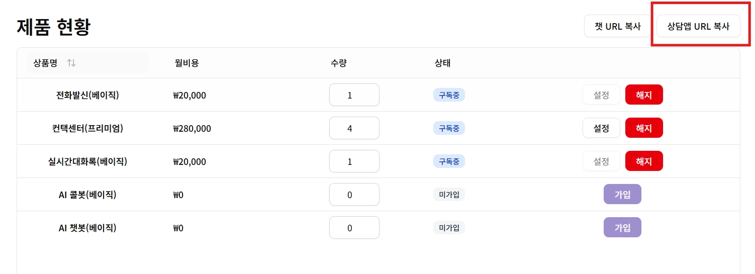 포털 제품현황 화면에서 “상담앱 URL 복사” 버튼을 클릭하여 새 창을 열어 복사합니다.