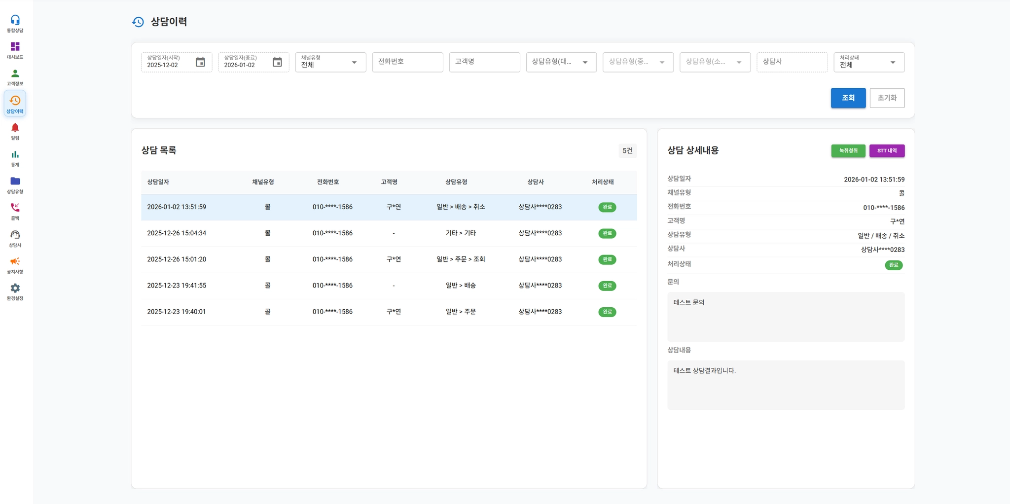 중앙 영역: 상담 처리 화면(상담처리 내역, 실시간 STT변환 등)