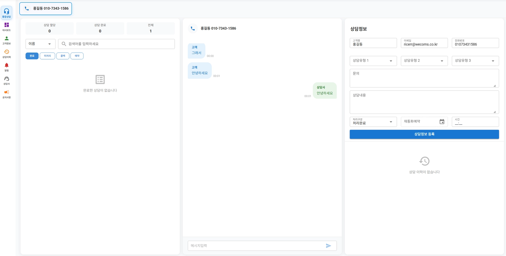 좌측 메뉴 영역: 주요 기능 메뉴(통합상담, 대시보드, 고객정보 등)
