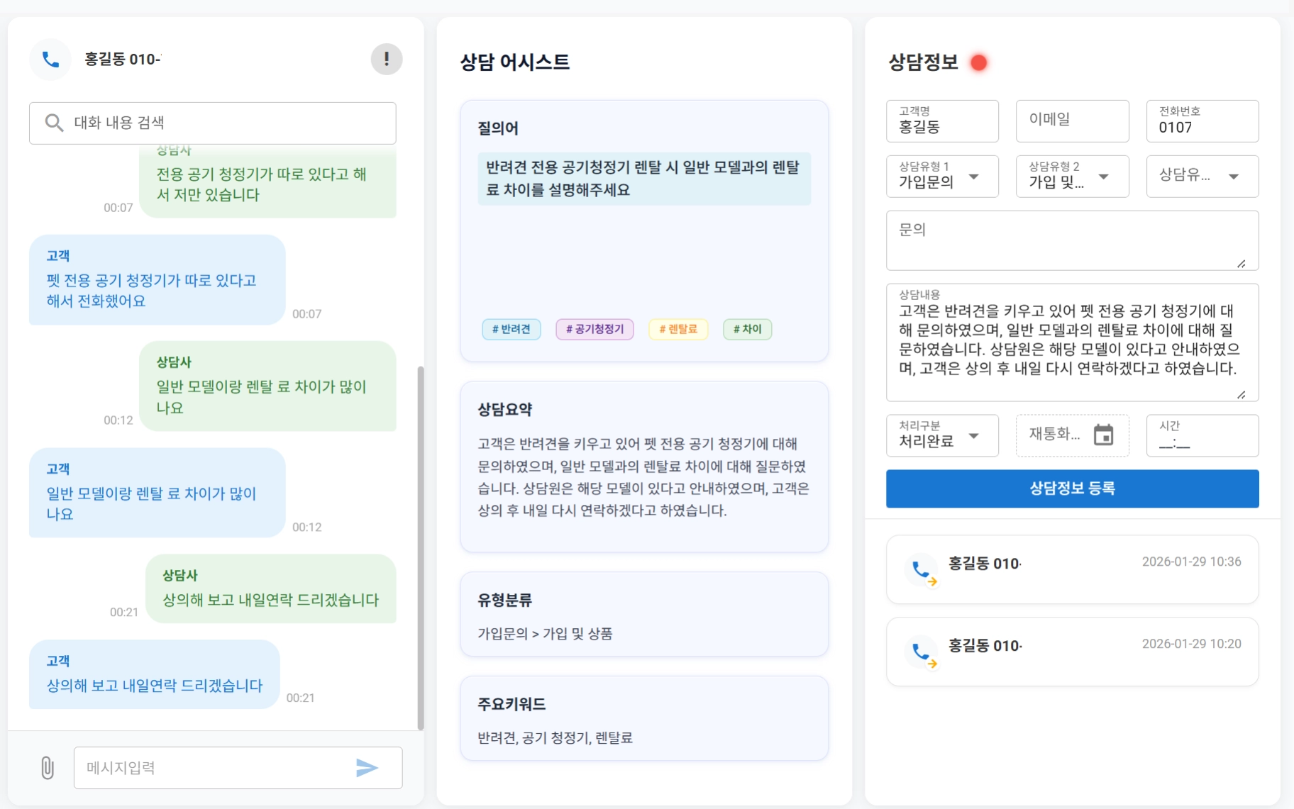 상담 종료 후 | 상담유형 자동분류, 상담요약 자동생성, 주요 키워드 제공 |