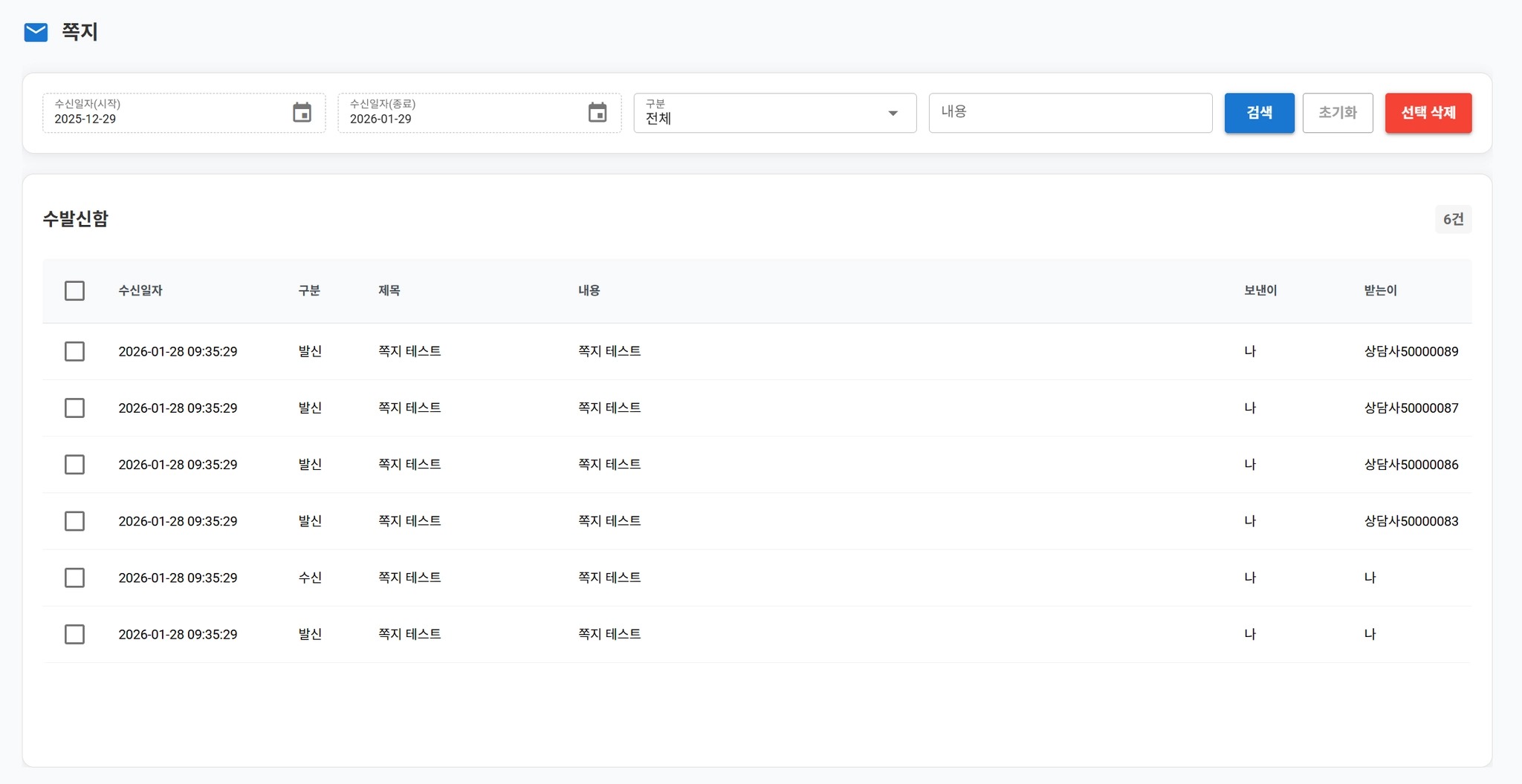 쪽지 내용 일부를 입력하여 검색합니다. (부분 일치 Like 검색)