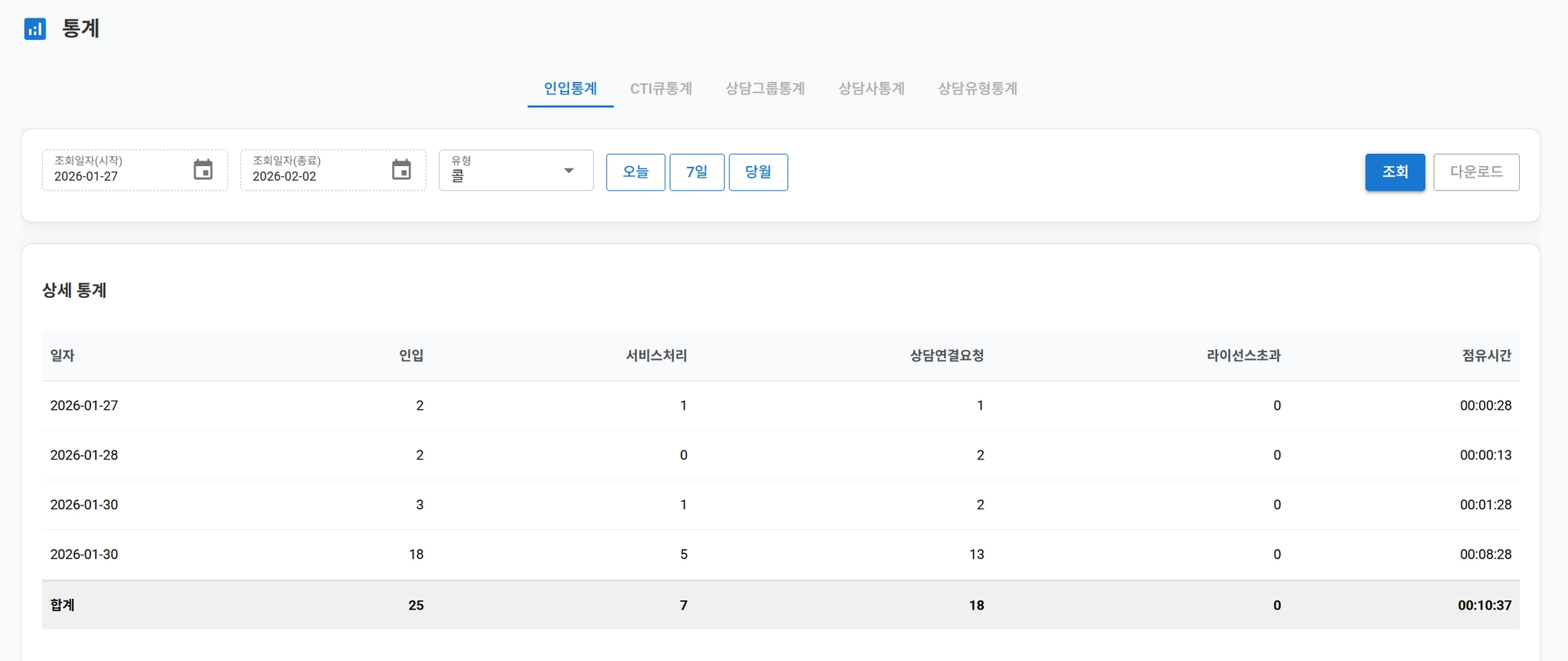 각 탭은 상담 이력의 처리 상태 및 상담 유형에 따라 자동 분류됩니다.